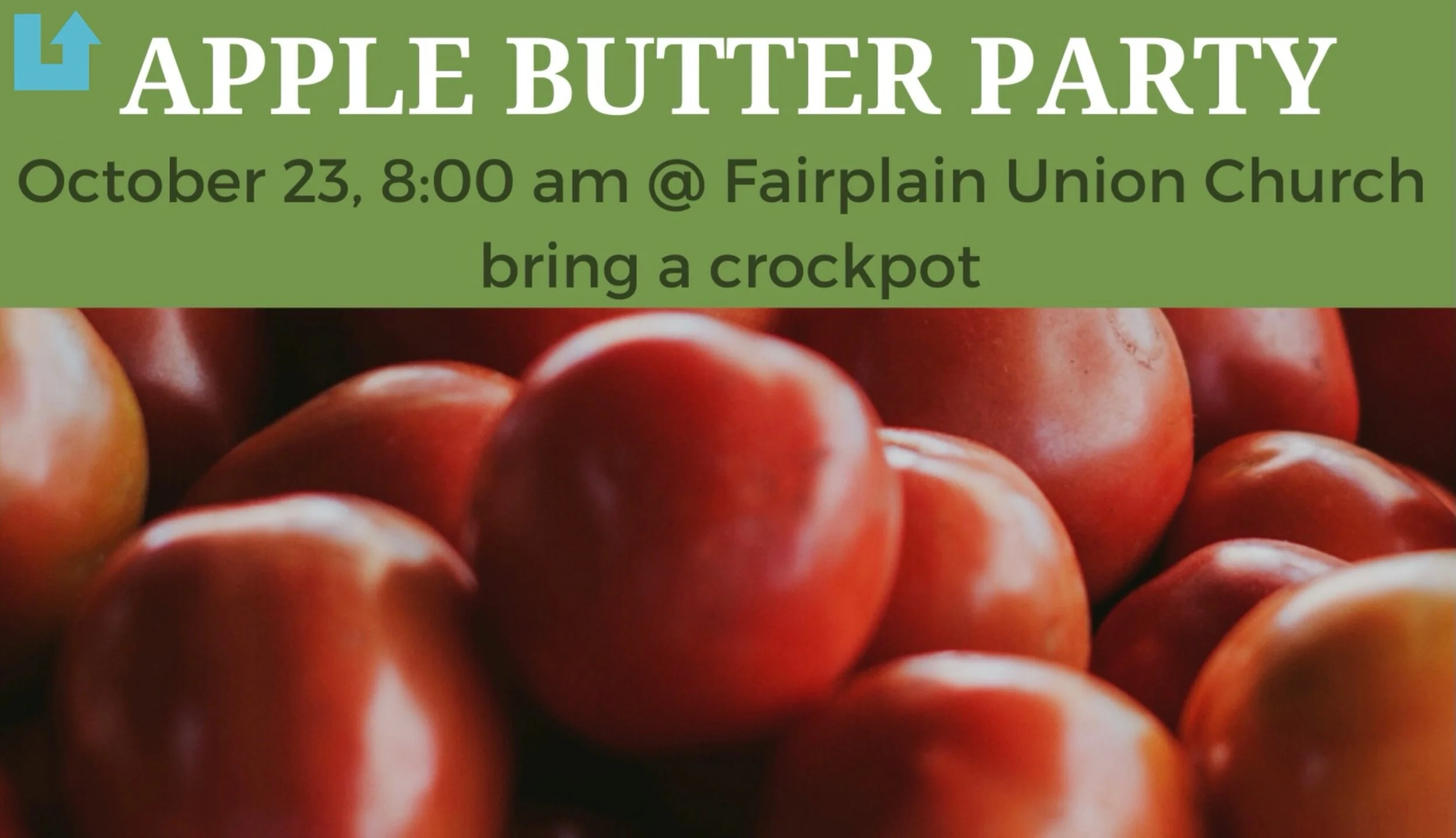 Oct 23 8:00 AM08:00 Apple Butter Party Saturday, October 23, 2021 8:00 AM 4:00 PM 08:00 16:00 Fairplain Union Church (map) Google Calendar ICS View Event →